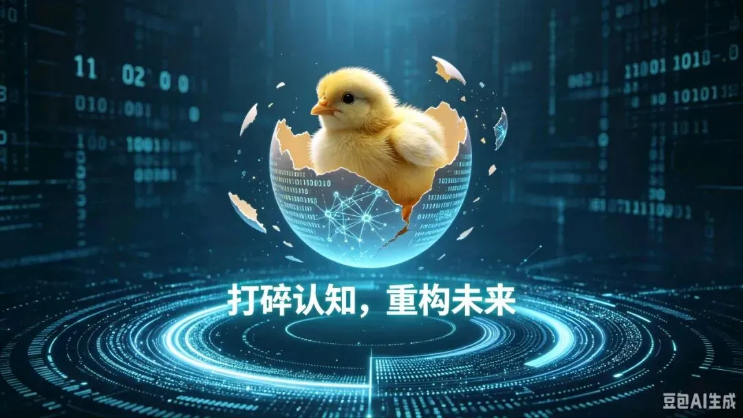 第二张图更直白:一只由“0”和“1”代码构成的蓝色小鸡,奋力顶破蛋壳。蛋壳内部,不是蛋黄,而是一枚散发着智慧光晕的AI芯片。图上的文字写道:“所有的出发,都必须先从打碎自己认知开始。”