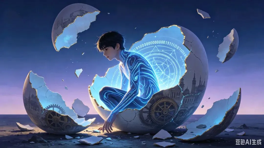 第一张图里,一个人形的头部正在破碎。 裂痕如冰纹般蔓延,但裂痕深处,不是黑暗与空洞,而是璀璨如星河的、发光的神经网络。碎片向外飞溅,像挣脱束缚的蛋壳。而在他的胸口下方,另一枚镌刻着二进制代码的蛋壳,正孵出一只通体流淌着数据光芒的雏鸟。