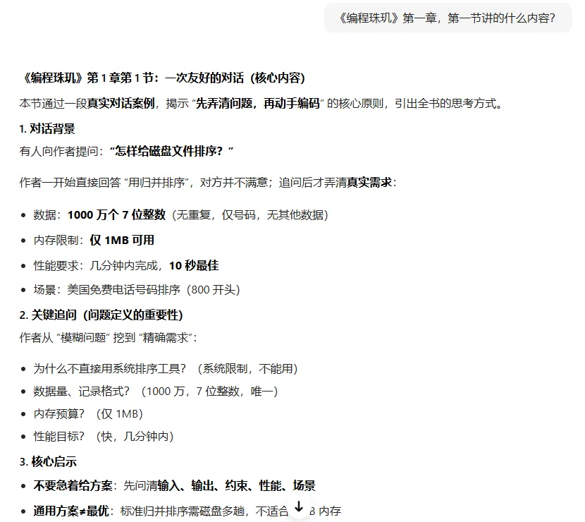Jon Bentley所著《编程珠玑》是计算机科学方面的经典名著,通过一些精心设计的的趣而又颇具指导意义的程序,对实用程序设计技巧及基本设计原则进行了透彻而睿智的描述,为复杂的编程问题提供了清晰完备的解决思路。书中很多编程技巧,如果有疑问,可能会卡壳影响阅读效率。现在有了AI,可以把AI当成老师,什么问题都可以问。