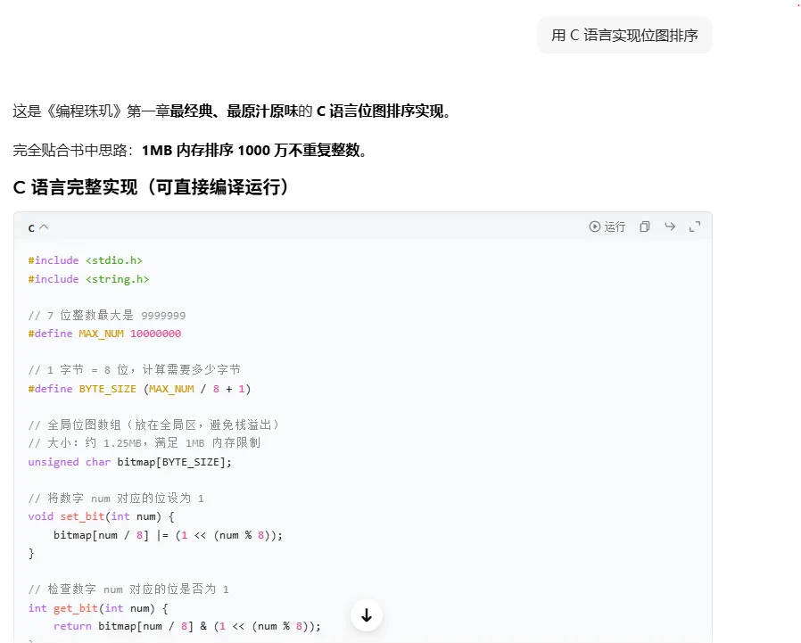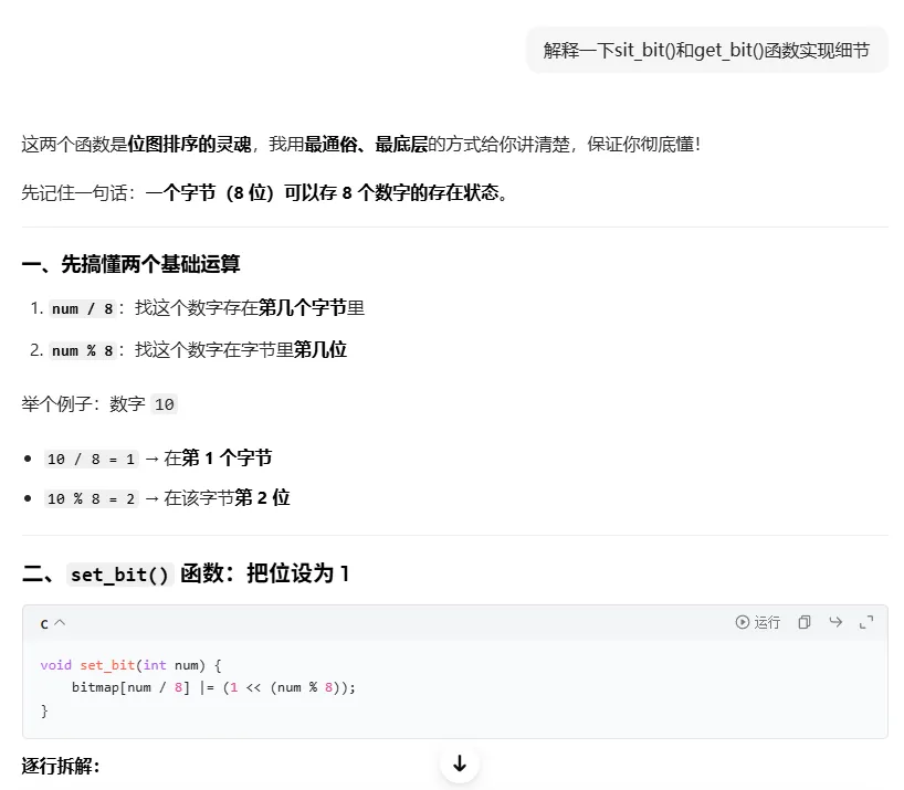 有一个功能完整可运行的示例代码是不是更便于理解。如果对于C语言中的位运算还有疑问,我们可以继续问: