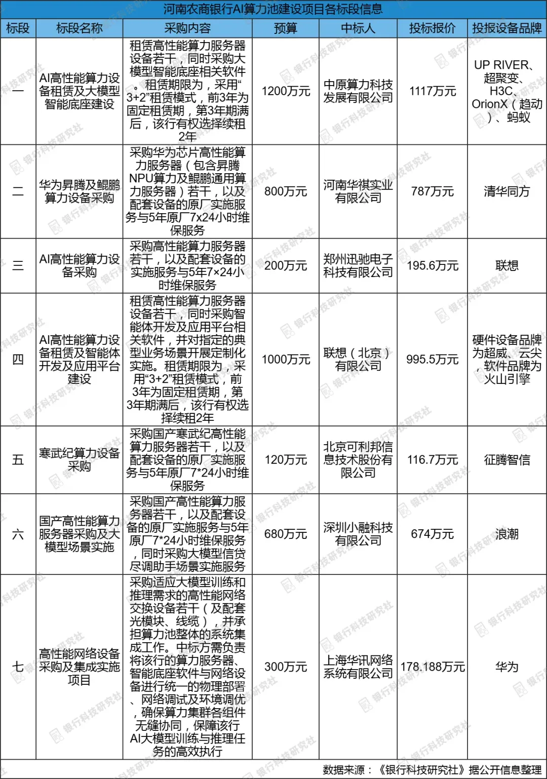 综合上述7个标段的中标价格,河南农商银行此次关于AI算力池建设的费用为4063.988万元,相较总预算,“节省”了200多万元。