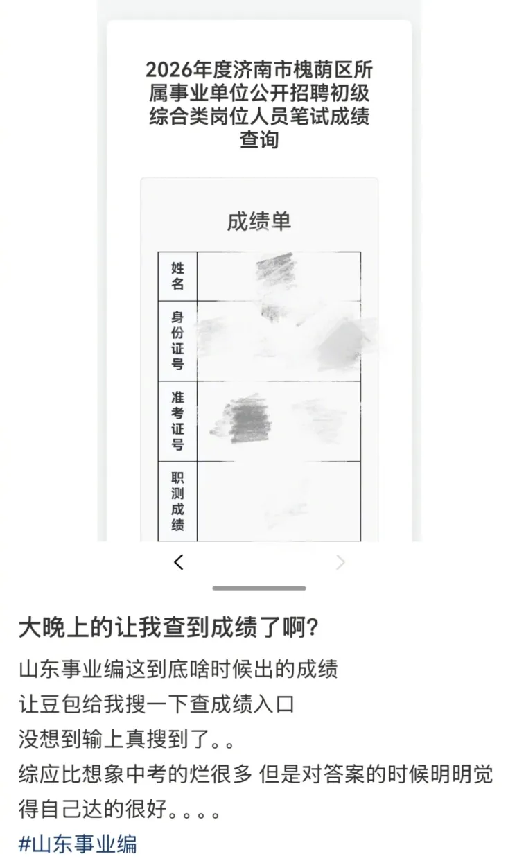 4月23日晚间,有网友发帖称,“豆包查到2026山东事业编成绩了”,并附上一张成绩单,但成绩部分涂掉了。“不过好像只有济南槐荫区的能查,是不是属实咱也不知道,到底啥情况呀?”4月24日, 记者联系上该网友了解到,帖子内容来自其他网友,但目前原帖网友已经删除了帖子。