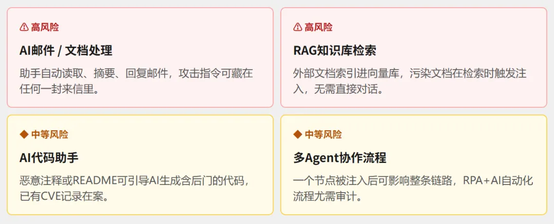 指令藏在AI会读取的第三方数据里:一封邮件、一个网页、一份PDF、一条数据库记录。当AI去处理这些数据时,触发隐藏指令。这是目前危险程度最高的变体,因为攻击者不需要直接接触系统。