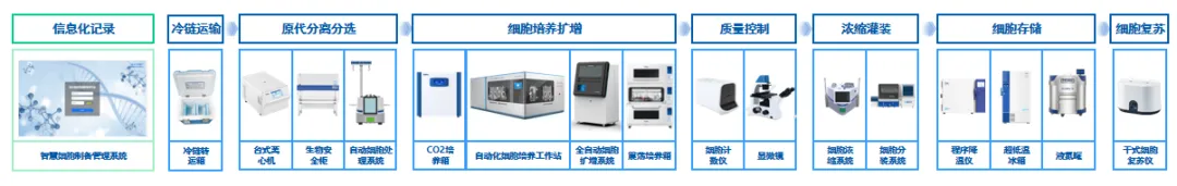 核心硬件包括:生物安全柜、台式离心机、自动细胞处理系统、细胞浓缩分装系统、CO₂培养箱、自动化细胞培养工作站、全自动细胞扩增系统、程序降温仪、超低温冰箱、干式细胞复苏仪、细胞计数仪、冷链转运箱等,实现细胞制备全流程标准化、自动化、密闭化运行,大幅提升制备效率与生物安全性。