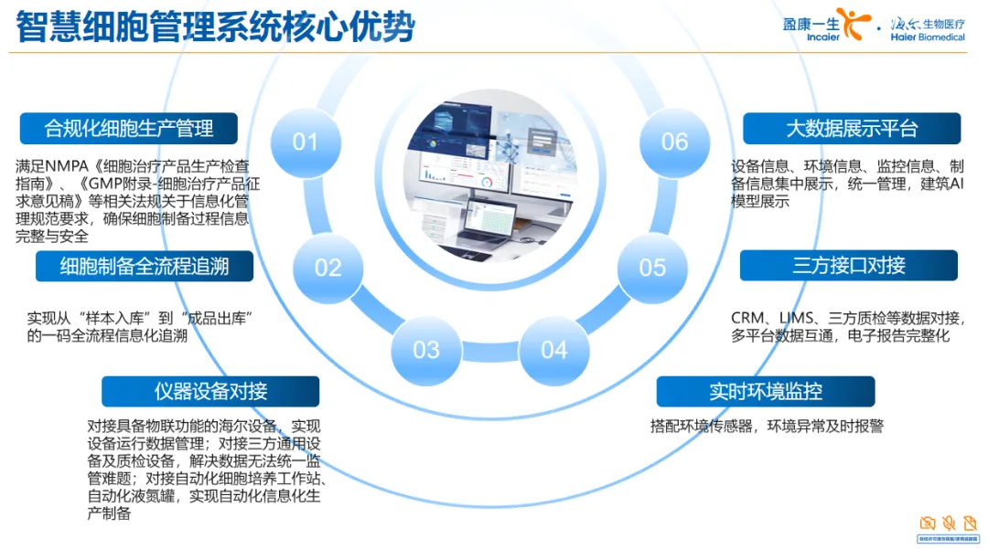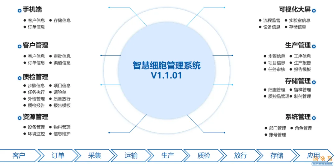 为实现全流程可管、可控、可溯,细胞库同步启用智慧细胞制备管理系统,以物联网与AI技术为核心,搭建覆盖订单管理、生产管理、质量管理、样本存储、物料管理、设备管理、环境管理、人员管理八大模块的数字化平台,实现“人、机、料、法、环、评、测”全要素数据互联,满足CoC监管链、CoI身份链要求,全面符合GMP、NMPA细胞治疗产品生产检查指南及21CFR Part11、GAMP5等合规标准。
