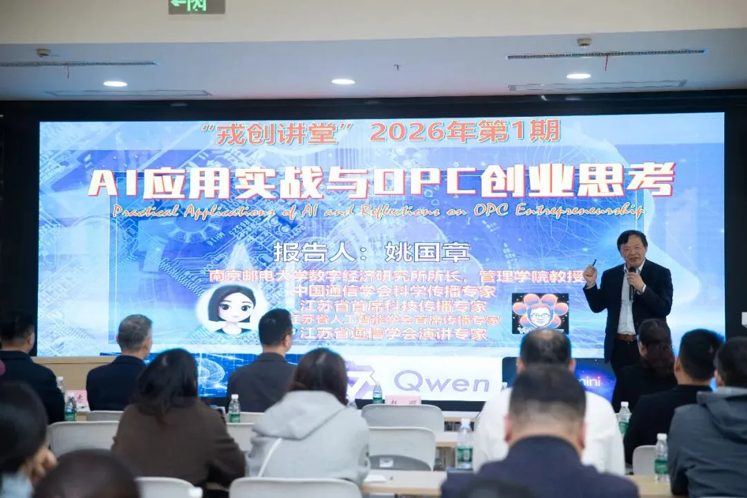 “AI不是程序员的专利,而是每个创业者手中的‘新质生产力’。”南京邮电大学数字经济研究所所长姚国章教授的开场,引来全场掌声。作为江苏省首席科技传播专家,他并未急于空谈理论,而是轻点遥控器,将AI大模型从GPT到国产迭代的发展脉络,清晰铺展在屏幕上。从基础应用到OpenClaw实践,再到AI赋能的OPC创业模式,他层层拆解,近两个小时的授课,浓缩了30余项国家级及省部级课题的积淀。讲到关键处,他转身面向投影屏,现场演示AI工具的操作界面,光标在屏幕上跳跃,台下随即响起一片手机拍照声。“这个指令怎么下,才能生成你想要的商业计划书框架?”他抛出问题,台下立刻有人举手互动。一场干货密集的“实战推演”,让不少老兵掏出手机全程录像。