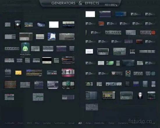 这类是发声源头:钢琴、鼓、合成器、弦乐、采样器等,本身可以独立出声音,用来做旋律、伴奏、鼓组。