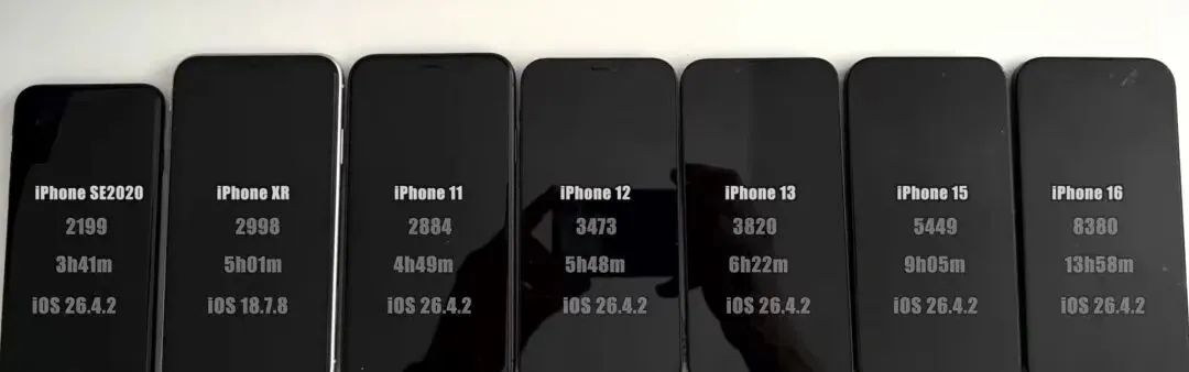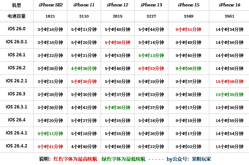 iOS 26.4.2 正式版系统电池续航结果出来了,iPhone 16 下降很多;数据仅供参考!