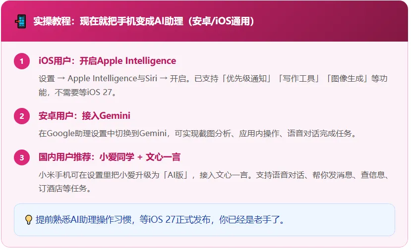 新Siri还没来,但现在就可以提前练手——手机变AI助理的方法,现在就能用。