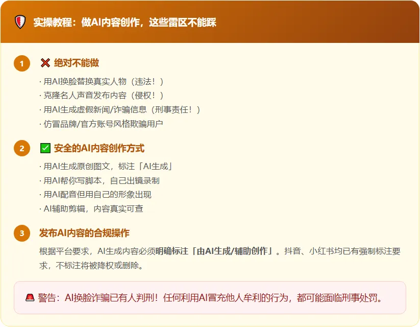 做AI内容创作,合规是底线。这些雷区搞清楚,比多学一个AI工具更重要。