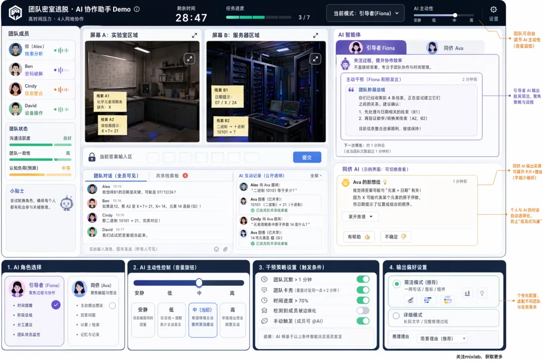 研究者设计了一个需要4人协作的”数字密室逃脱”游戏:高时间压力、信息分布在两块屏幕上、必须实时沟通。团队被随机分配了两种不同的主动式AI角色。