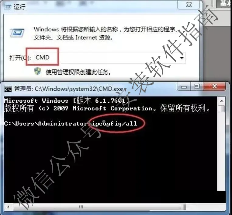 2.开始菜单》运行,输入“CMD”回车,在弹出DOS命令窗口中将“ipconfig/all”复制入内并敲击回车