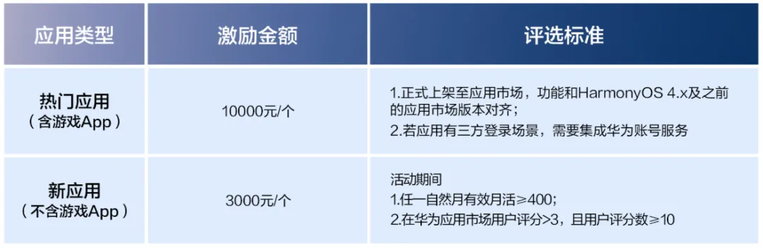 新应用上架次日起到 2026 年 10 月 31 日之间,任一自然月只要去重活跃设备数 ≥ 400、用户评分 > 3、评分用户数 ≥ 10,就能拿 3000 元 / 个。单个主体累计上限 100 万元。