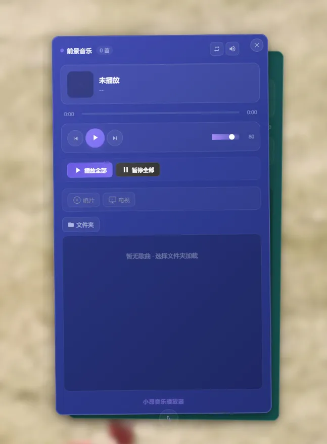 这个播放软件是一个本地音乐播放软件所以播放你下载到本地的音乐,点击界面上的文件夹按钮选择到音乐所在的文件夹就可以导入文件夹中的所有音乐,前景音乐和背景音乐是分开导入,分开播放的,背景音乐我内置了5种场景的白噪音当然你也可以在网上找一个老师讲课的那种白噪音当着背景音,把音量开大一些,然后再播放自己喜欢的歌曲,声音小一些,体验一下当初课堂上偷偷听音乐的感觉。