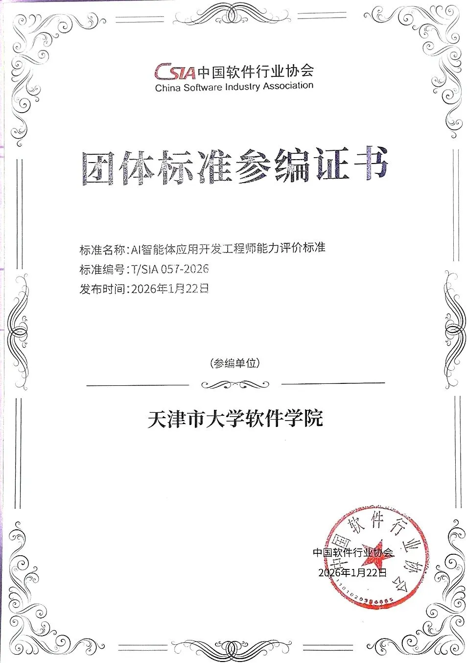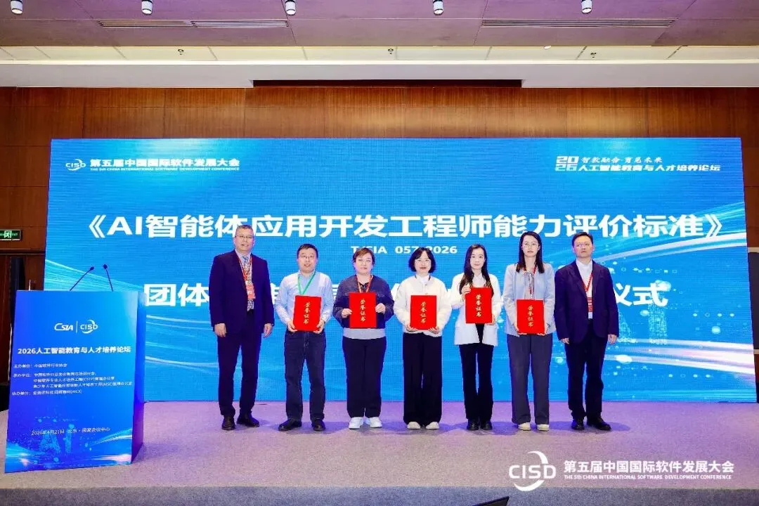 论坛期间,我校作为《AI智能体应用开发工程师能力评价标准》(T/SIA 057-2026)团体标准起草单位之一,参加了标准起草单位及个人授证仪式,并获颁荣誉证书。该标准由中国软件行业协会正式发布,系全国首个AI智能体人才能力评价团体标准。