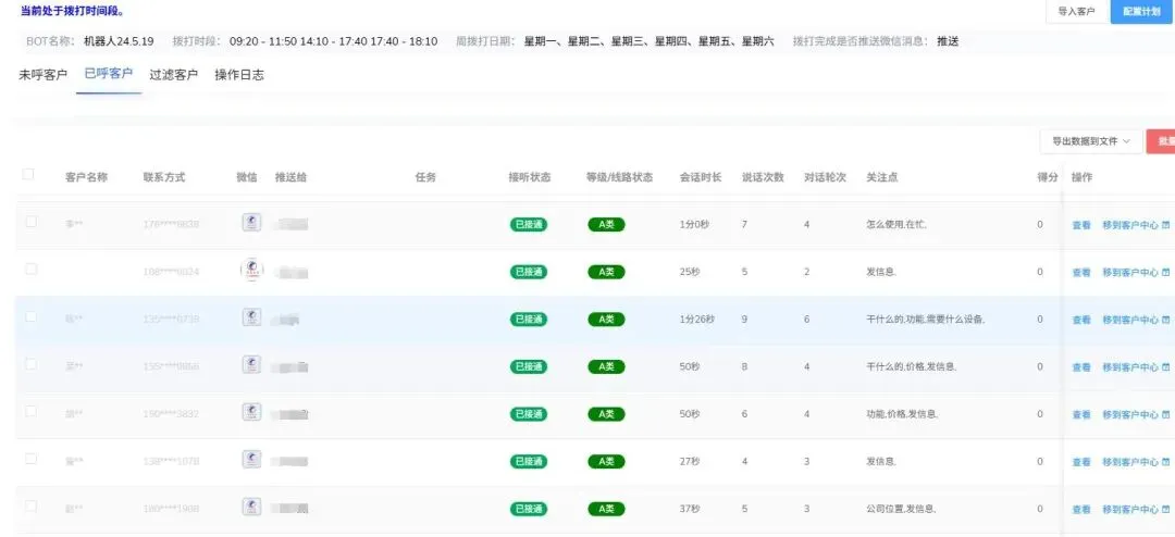 ai智能电话机器人,可以代替人工自动拨打电话,在通话过程中会按照我们设定的话术与客户进行沟通,同时会将用户按标签分为A/B/C/D类客户,然后会将意向客户推送到你的微信上。