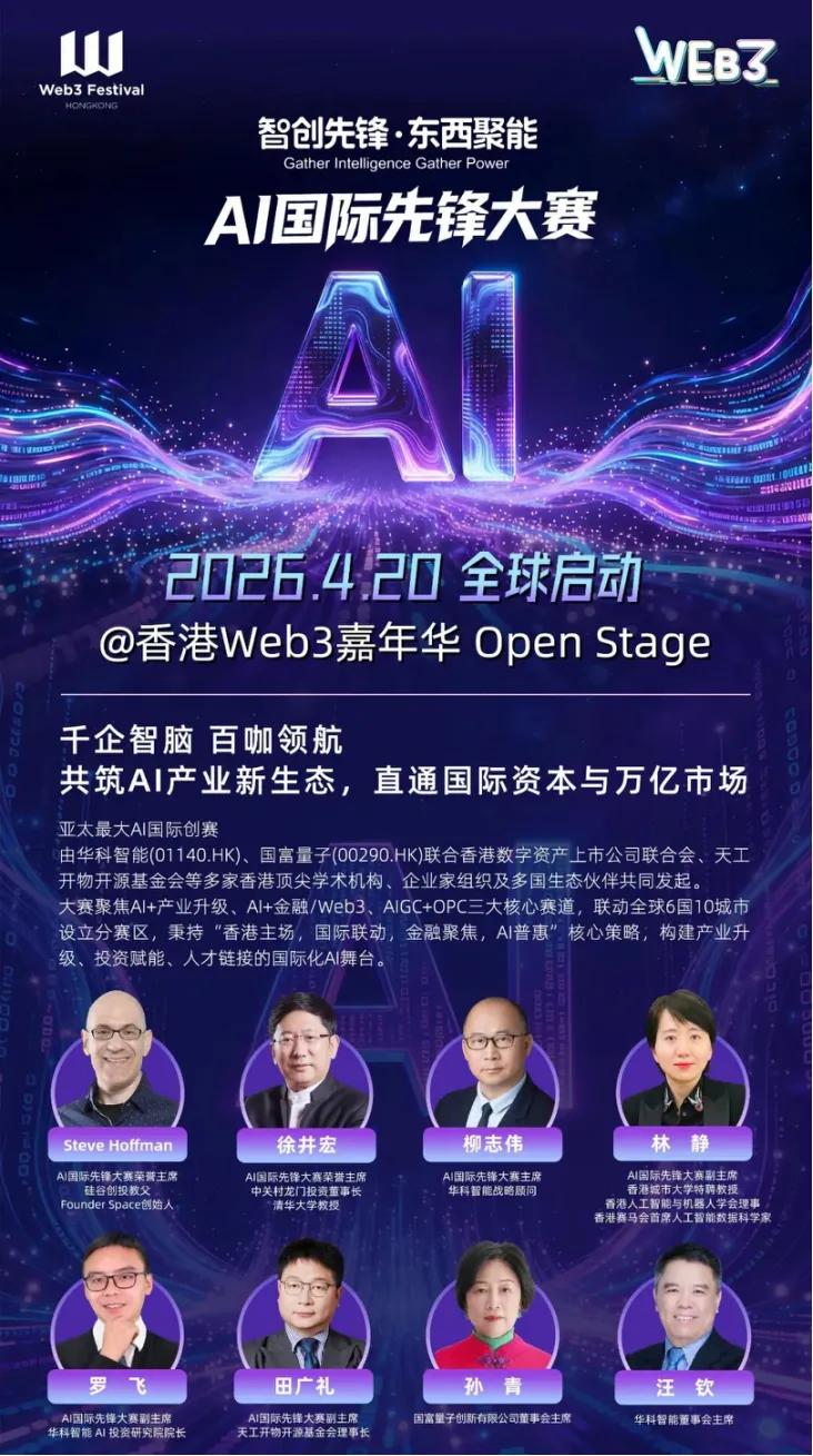 首届AI国际先锋大赛以“智创先锋·东西聚能——Gather Intelligence, Gather Power” 为核心主题,秉持“香港主场,国际联动,金融聚焦,AI普惠”的核心策略,立足粤港澳大湾区,辐射全球AI创新项目。大赛依托一个AI 量子产业联盟,一个AI 开源生态,联合一支国际化产业资本矩阵,共同打造AI 时代,政产学研联合的产业赋能矩阵。大赛联合全球6国10城的AI创新热点区域设立分赛区,包括香港、北京、上海、深圳、杭州、硅谷、伦敦、阿布扎比、新加坡市、东京等,报名时间从2026年4月20日持续至6月30日。