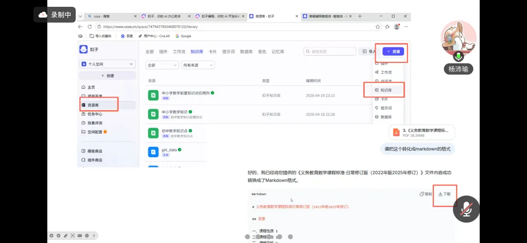 沙龙现场,杨沛瑜老师实操演示了依托扣子(Coze)平台搭建数学答疑智能体的全路径。基础层面,她构建”文本输入+图片上传”双通道交互模式,通过”理解图片”节点解析题目,结合文本生成规范解答;强调知识库需将教材转为Markdown格式上传,开启”提取图片”功能,确保回答贴合课标。