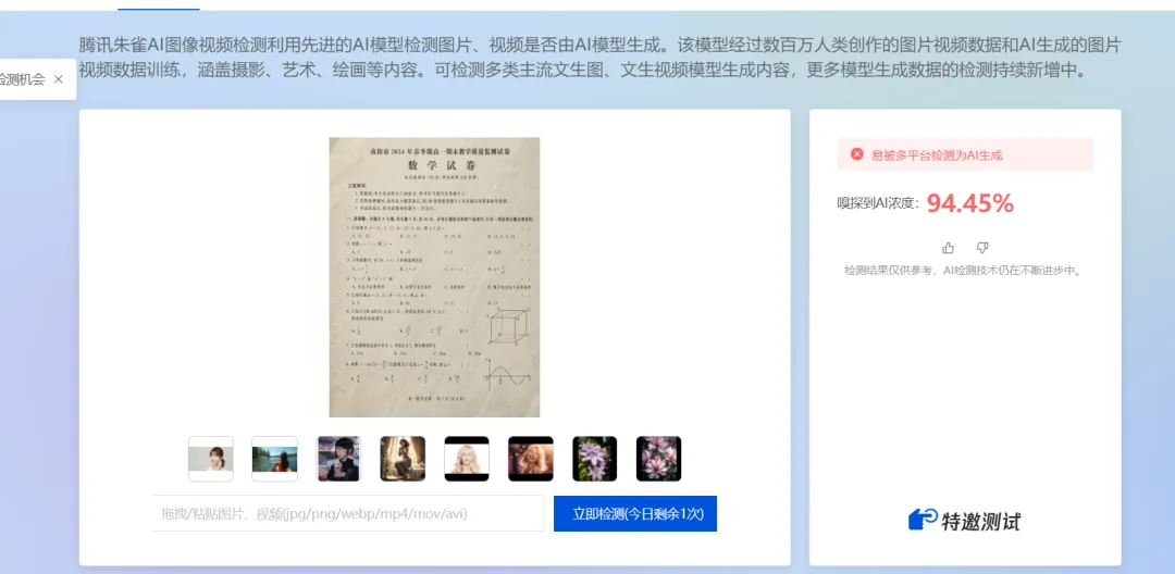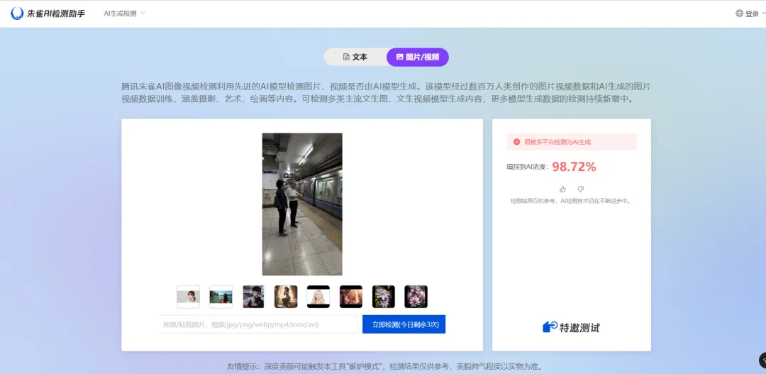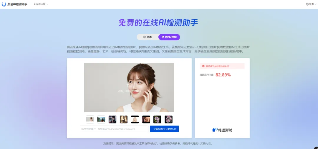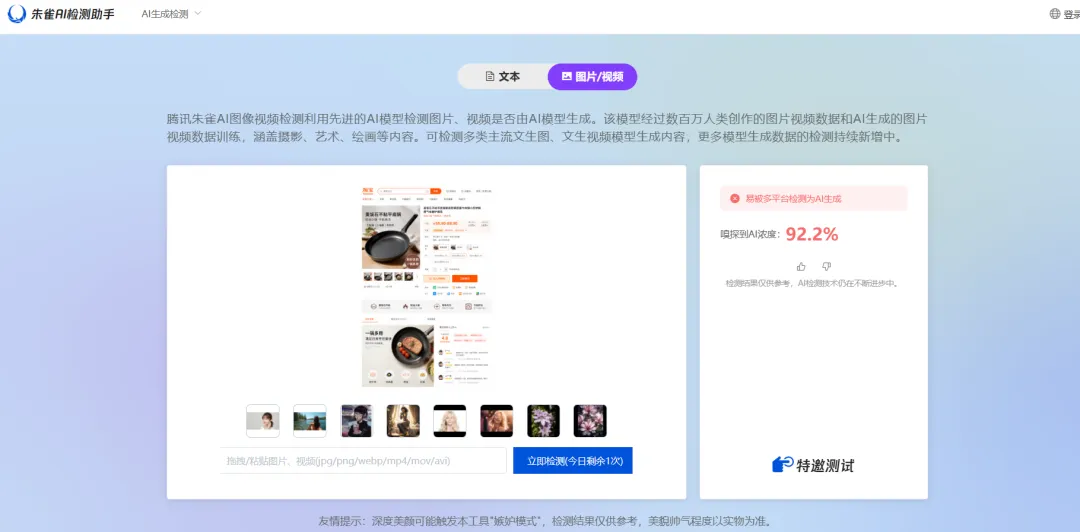 只需登录腾讯朱雀AI检测官网,选择检测类型即可:图片检测直接上传待检测图片,3秒内就能拿到专业报告;