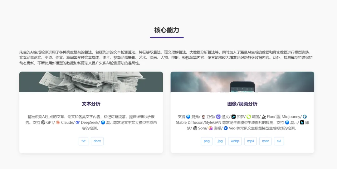 文本检测可以粘贴文字或上传文件,快速获取AI生成概率分析。