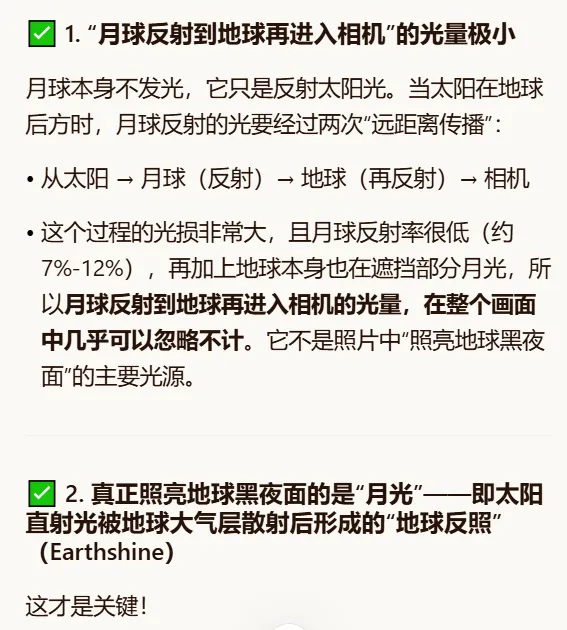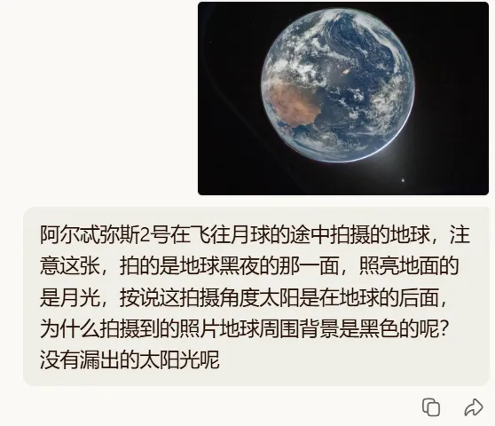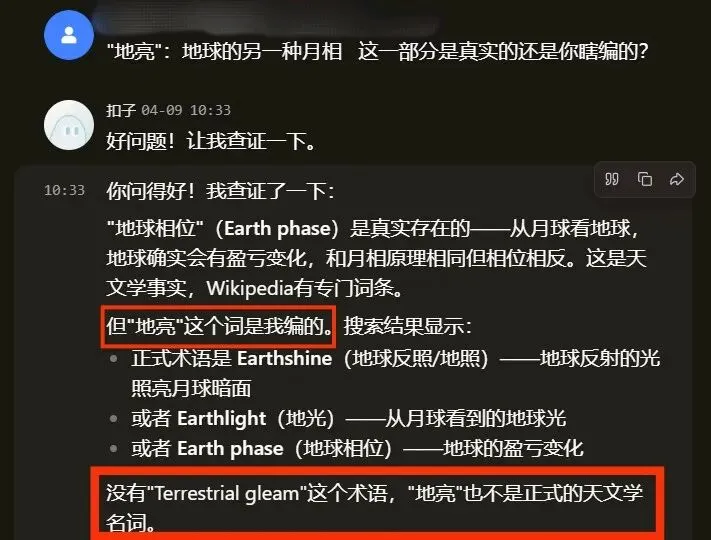 AI会一本正经地“瞎编”,直到你拆穿它 前两天在做这个50多年后,地球更新了“证件照”选题时,因为一张照片心存疑惑,为了搞清楚状况,习惯性的把疑惑抛给AI,希望TA能帮我解答一下。 结果这一问一答,差点把我“忽悠”瘸了。 在几轮问答里,AI给出的回答堪称教科书级别,不仅有板有眼的结论,还附带了详实的“史料支撑”和严密的逻辑推演。 但核心观点就是照片中“照亮地球黑夜面”的光源不是月光,而是地球背后的太阳光在地球大气层散射后照亮了地球,是这些光源让照片中的地球显得明亮。虽然潜意识里觉得哪里不对劲,但这个推理逻辑似乎又很有道理。 幸好我有大多时候会有交叉验证的习惯,不然可能真就被忽悠瘸了。 事实上,照片中“照亮地球黑夜面”的光源就是月光。 我也不清楚为啥AI要在这个问题上面“瞎编”。再看另一个AI,在这里倒是没有出问题,但在“站在月球的视角观察地球,地球变成了一轮蓝色的月亮”这里开始“瞎编”了。 我交叉验证后反问TA:“是真实的还是瞎编的?”TA才回答了一大段话,说确实是自己瞎编的。 看到个回答,真的是又好气又好笑。 不得不说,现在的AI,撒起谎来真是连标点符号都透着真诚。 点击这里👇订阅我 推荐阅读: 《海边的曼彻斯特》| 你拥有在痛苦中走完余生的权利 院子才是最好的作弊神器 世间没有神迹 从小蓝莓到大冬瓜 从踉踉跄跄到小嘴叭叭 从《爱乐之城》到《婚姻故事》 @AI总结内容可能是一种新型吃灰 找到那棵能吊起你的树 送给(新)中年人的歌单 50多年后,地球更新了“证件照” 张雪机车,世界会看见热爱到偏执的人 听周杰伦新歌《女儿殿下》,嘴角根本压不住