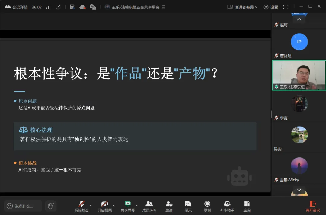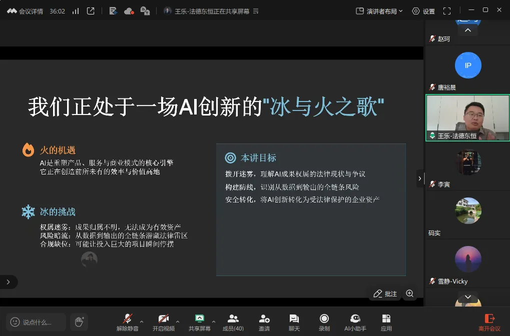 培训中,王乐律师从法律定性与司法实践、全链路风险溯源、合规体系构建三个层面,系统梳理了AI成果在数据输入、算法处理、商业输出等环节面临的法律挑战,并结合国内外典型案例,为企业提出了合同约定、流程留痕、内部制度完善等务实建议,帮助企业在AI应用中做到权责清晰、风险可控。