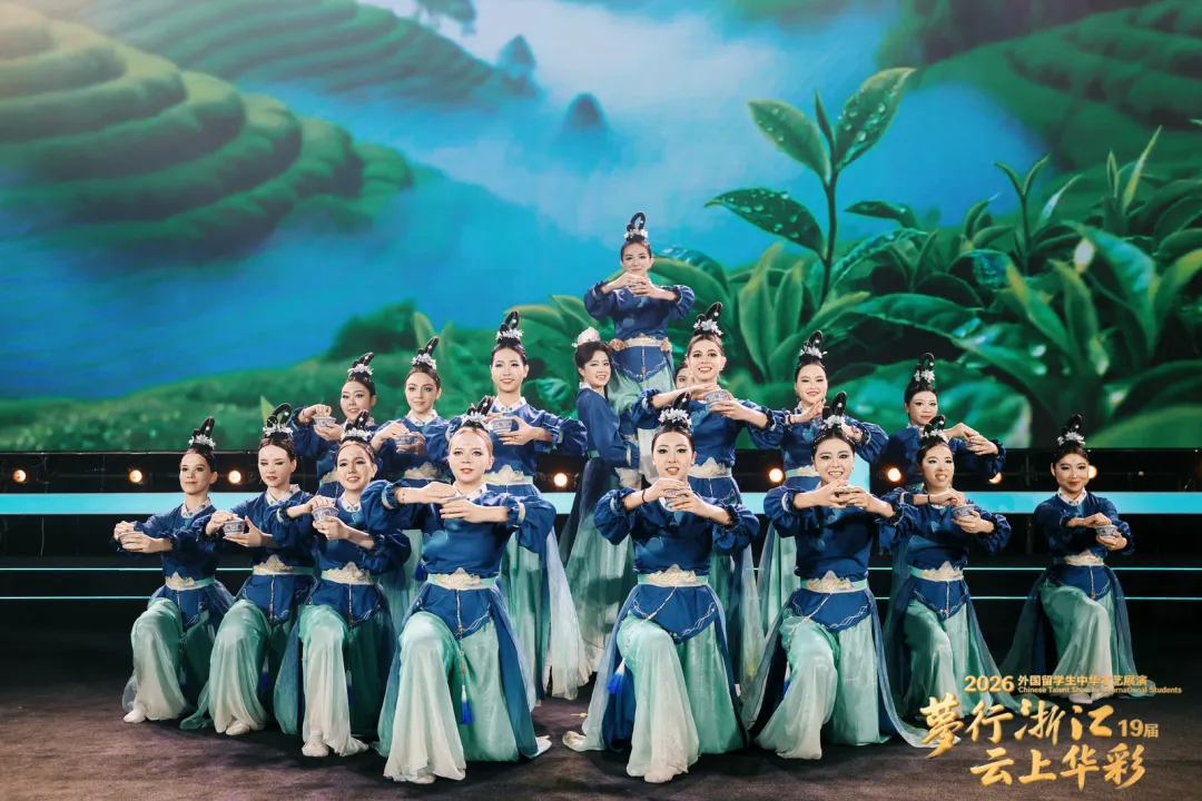 浙江工商大学的舞蹈《茶脉》,从采茶、炒茶到品茶,用每一个动作讲述茶文化的故事。来自法国的留学生安时感叹:”听说今晚有茶、有诗、有故事,我第一个报名来主持!中国茶不仅是一种饮品,更有一种’安静’的力量。”