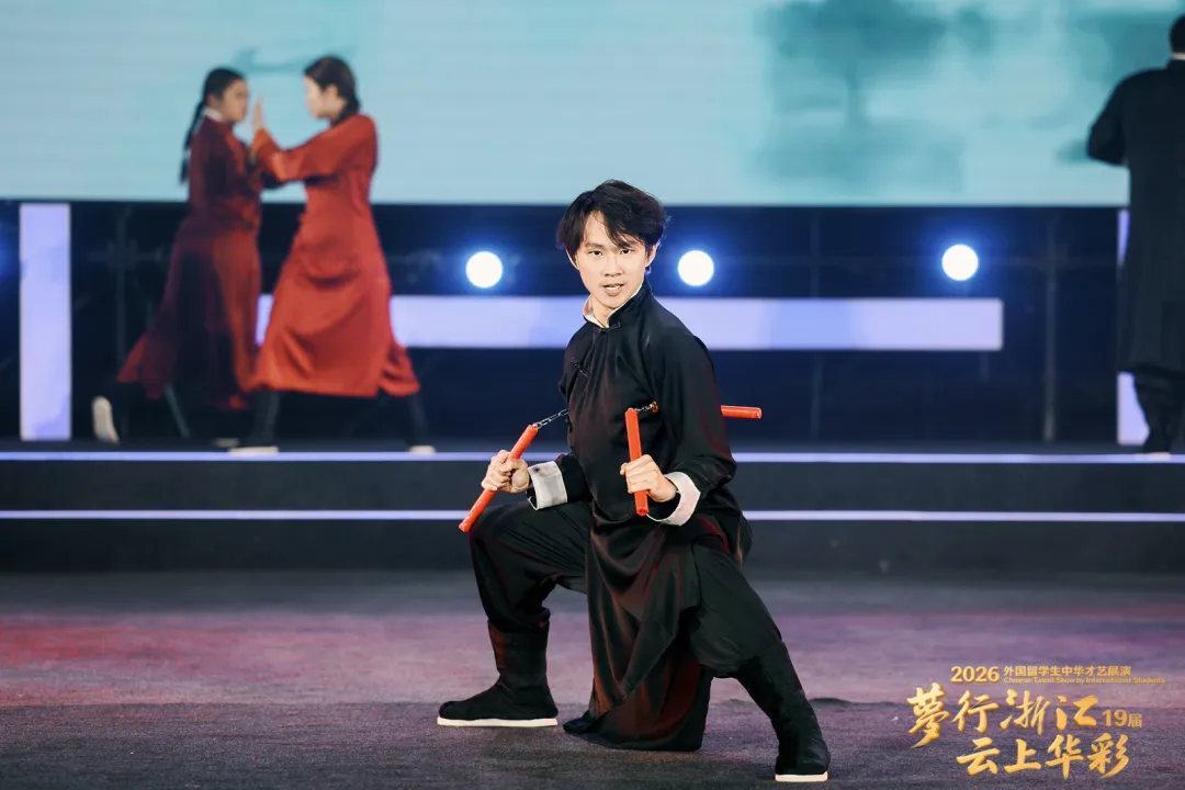 活动伊始,东道主杭州电子科技大学的留学生以一支充满科技感的舞蹈《全球输入中》点燃全场。作为”中国IT企业家的摇篮”,杭电留学生用代码与舞步的创意融合,诠释了从全球各地”输入”到中国的留学生活。来自美国的留学生主持人叶明凯兴奋地说:”作为东道主,今晚能在家门口主持,真的太酷了!”