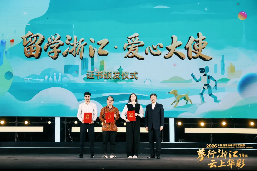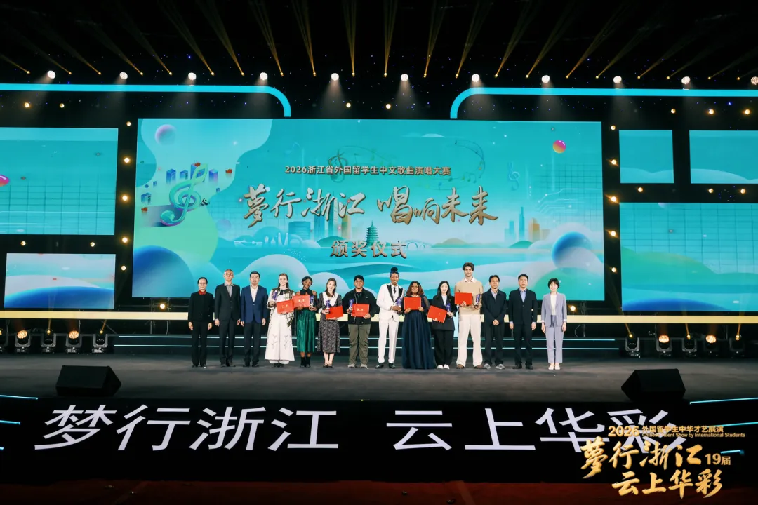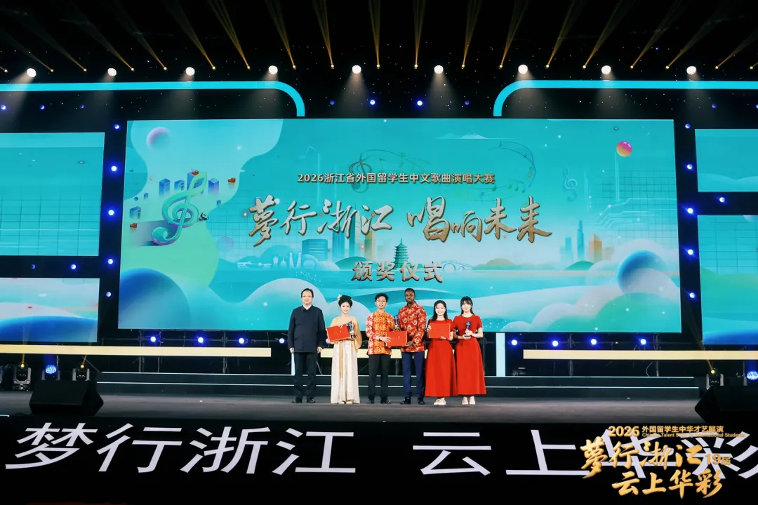 当晚,备受瞩目的”梦行浙江 唱响未来”浙江省外国留学生中文歌曲演唱大赛颁奖仪式也在展演中举行。全省40多所高校、200多名国际学生参与角逐,经过层层选拔,最终评选出一等奖3名、二等奖7名、三等奖12名。晚会现场还举行了“留学浙江 爱心大使”证书颁发仪式,杭州电子科技大学摩洛哥留学生尤博、中国美术学院新加坡留学生胡建成、湖州师范大学俄罗斯留学生莎河娜斯凭借在浙江践行的善举和大爱获得了“留学浙江 爱心大使”荣誉奖项。