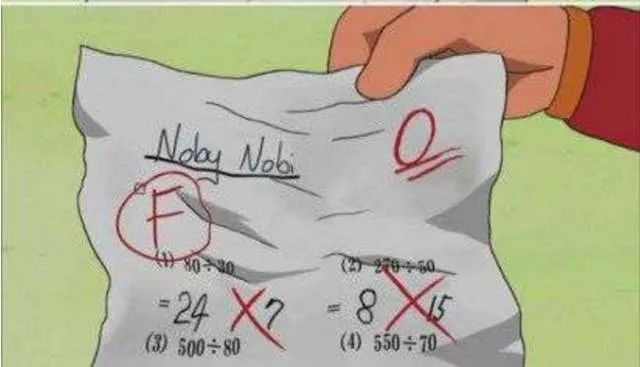 4.就连大雄的0分考卷也不一样了!加上了一个代表不及格的“F”,名字也改成英文的Noby Nobi,改题的方式也变成欧美人习惯的方式!
