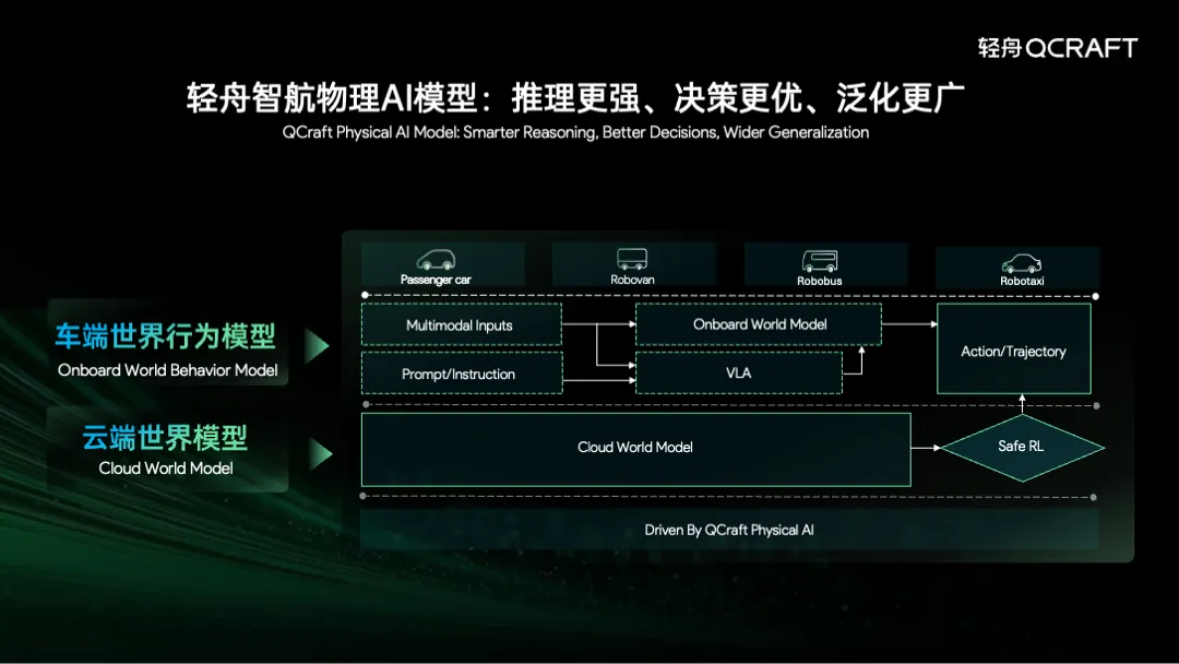 发布会上,基于“世界模型+强化学习”统一架构的物理AI模型重磅亮相,云端与车端双引擎首次完整发布;超500TOPS算力的“轻舟乘风MAX”极致城市NOA方案同步推出;并披露L4级Robotaxi与Robovan最新进展;公司使命愿景也迎来全新发布升级……
