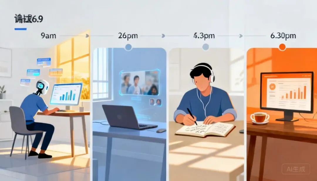 傍晚六点半,AI自动推送今日工作总结。她扫一眼,关机。