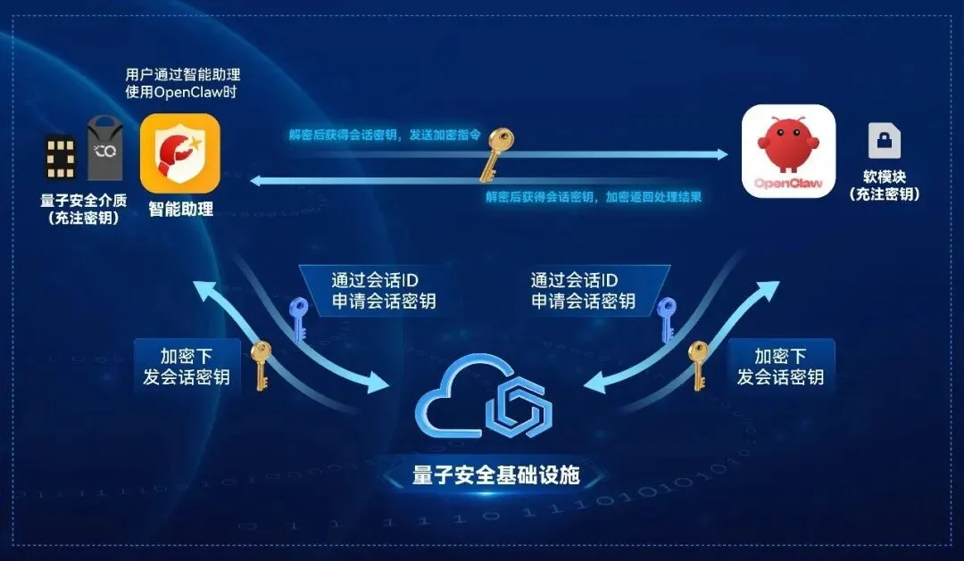 用户与OpenClaw交互时,可一键开启量子加密。开启后每一次对话都将调用提前充注的量子密钥进行鉴权,并向量子密码服务平台申请一支仅用于本次会话的专属密钥,通过平台下发的会话密钥对智能助理和OpenClaw对话进行端到端保护,“一次一密”,阻断不法分子的破解路径,让敏感指令传输全程无虞。