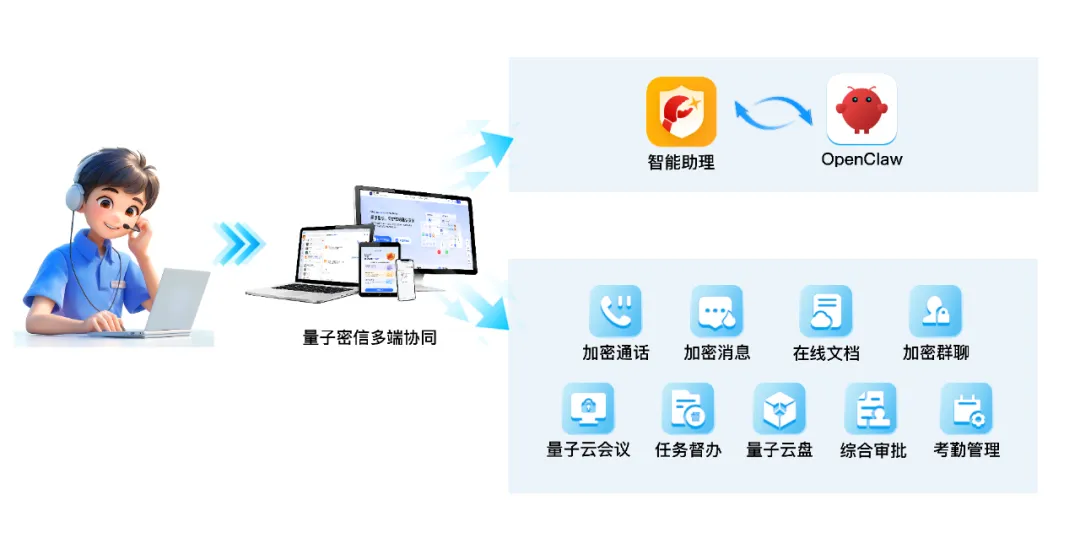 天翼量子密信“智能助理”,以天翼量子密信APP为入口,为用户提供从OpenClaw部署安装-配置-使用的一体化解决方案。同时基于量子安全基础设施,对用户指令、身份信息、生成内容进行量子加密,让用户能随时、随地安全“养虾”。