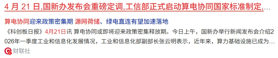 4 月 21 日,国新办发布会重磅定调,工信部正式启动算电协同国家标准制定,源网荷储全链条推进,从政策引导升级为全国强制落地。国家数据局更是明确要求,八大算力枢纽新建智算中心绿电占比 2025 年必须超 80%,不达标直接停工、取消补贴,2026 年已进入刚性考核。