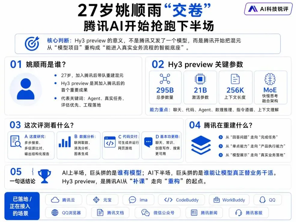 4月23日,腾讯混元 Hy3 preview 正式上线并开源。这是姚顺雨归国加盟腾讯后,带队交出的第一个重要成果,也是混元团队在架构、基础设施重新出发后的首个版本。