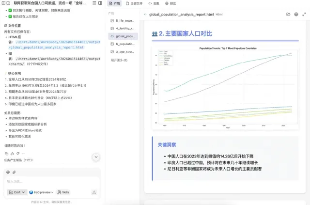 比如我们要求它联网获取联合国人口司数据,完成一项「全球人口结构变迁」可视化分析。