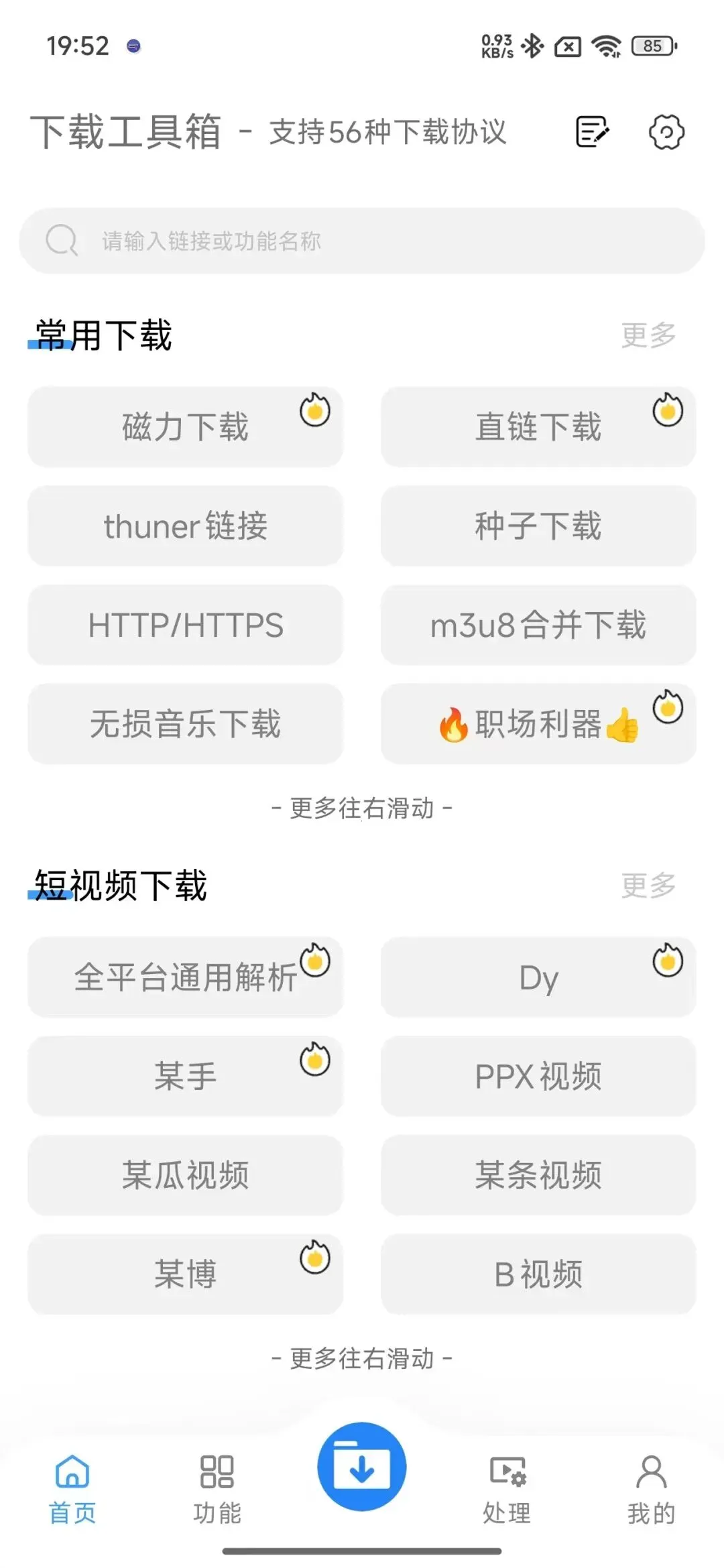 一款集合下载、视频处理、AI图文、办公辅助于一体的全能手机工具,适配多种下载协议,一站式满足日常各类使用需求。