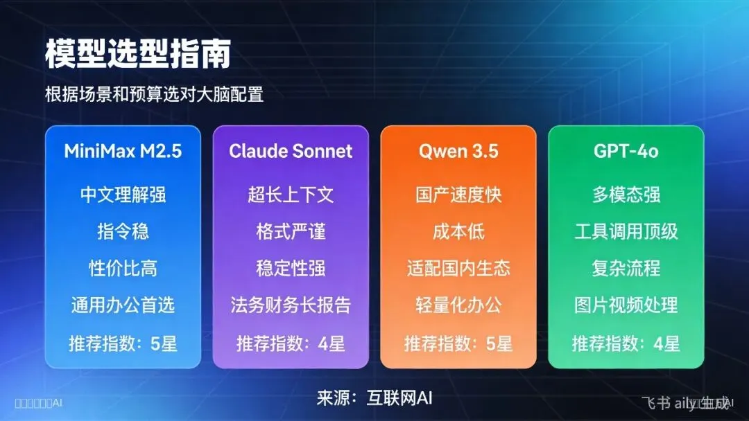 个人用户/初创团队:选 MiniMax M2.5 或者 Qwen 系列。 原因很简单:中文理解好,响应快,成本低。个人使用的话,API 调用量不会太大,性价比是首要考虑。这两个模型在处理常规办公任务(写周报、发邮件、数据整理)上表现都很稳定。 中小企业:可以优先用 MiniMax M2.5,如果对内容质量要求更高(比如营销文案、方案撰写),考虑 Claude Sonnet。 法务/财务/需要处理长文档的岗位:直接上 Claude Sonnet。 它的超长上下文处理能力是真的强,几十页的合同丢进去,分析逻辑清晰、格式严谨,几乎不用返工。普通模型处理长文本容易丢信息,这个问题 Sonnet 解决得比较好。 复杂流程/多模态需求:GPT-4o 或者 Claude Opus。 如果你的工作涉及图片处理、视频内容理解这种多模态任务,这两个模型更合适。日常的文字处理其实用不着这么强的配置。
