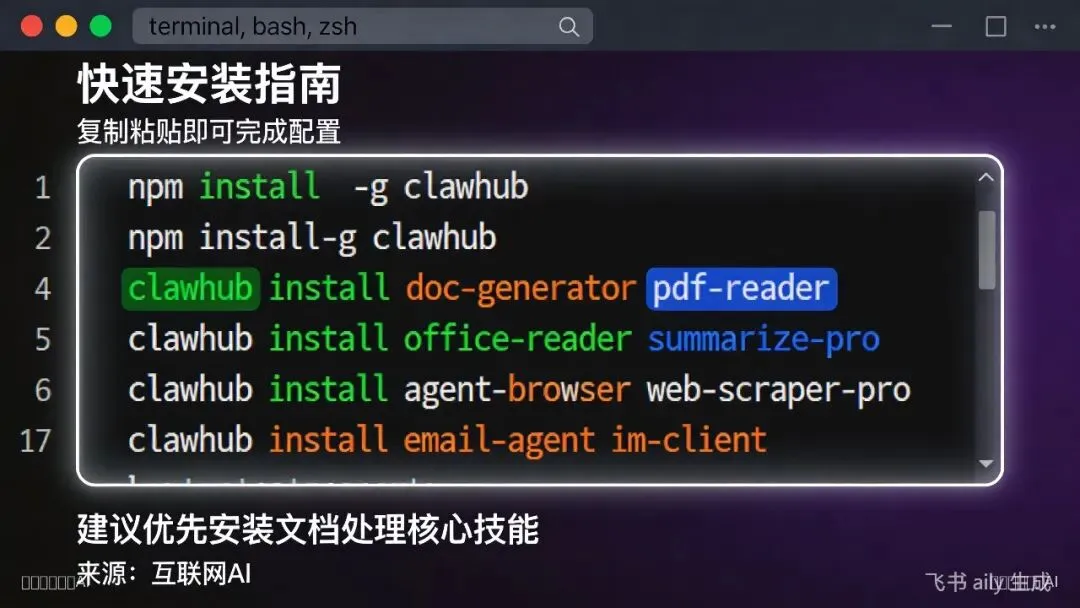 # 安装 clawhub 工具 npm install -g clawhub # 批量安装核心技能 clawhub install doc-generator pdf-reader office-reader summarize-pro clawhub install agent-browser web-scraper-pro email-agent im-client