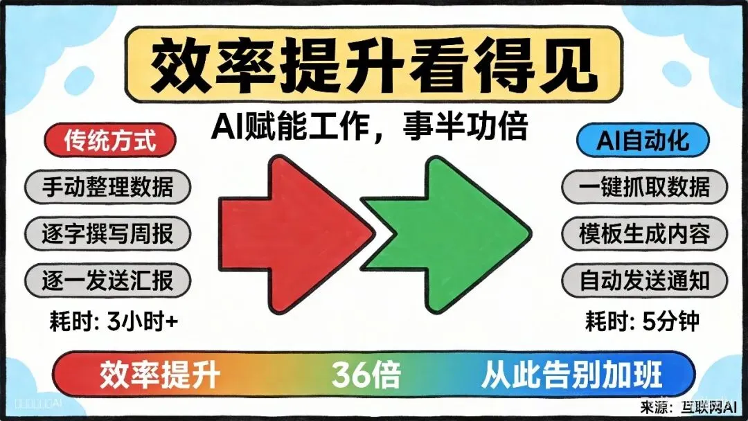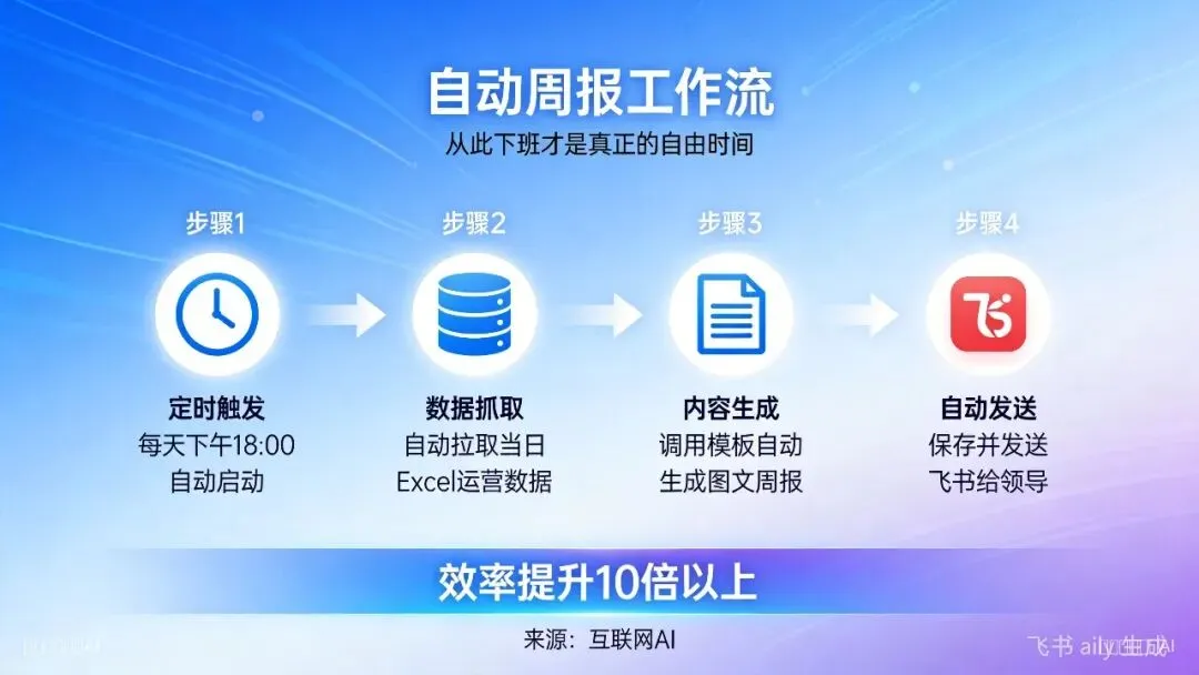 拿我自己现在在用的周报自动化流程举例: 每天下午六点,系统自动触发,开始工作。 第一步,去运营后台把当天的数据拉下来——访问量、转化率、新增用户数,自动填进 Excel 模板。 第二步,调取本周的飞书群聊记录,提炼出几个关键进展:产品迭代、用户反馈、遇到的问题。 第三步,把这些内容喂给 doc-generator,按照预设的周报模板生成完整的图文报告。 最后一步,发送飞书消息给领导,顺便抄送到项目群。 整个流程跑下来,从触发到完成,大概三到五分钟。以前手动整理这些内容,少说也要半小时。