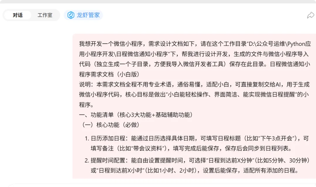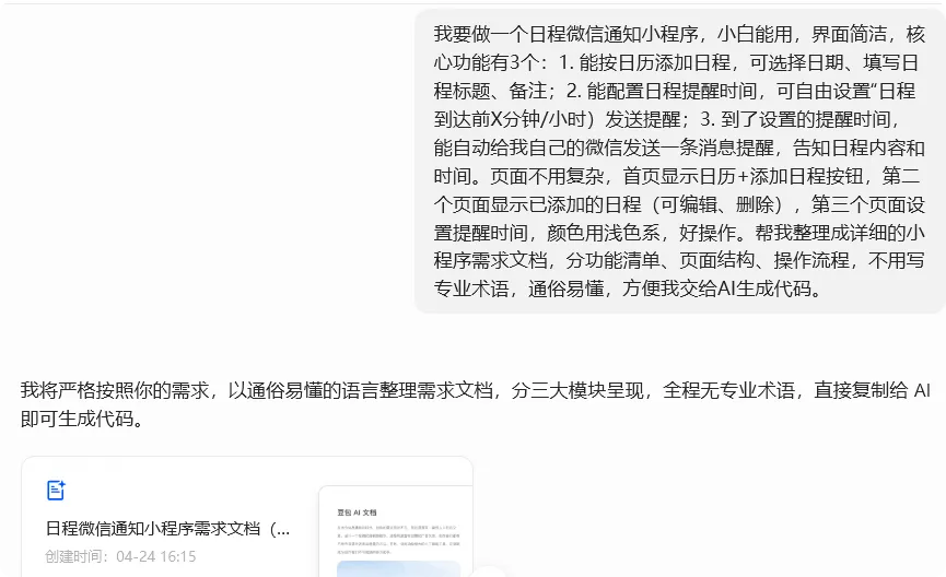 这一步是关键,也是小白最容易卡壳的地方:脑子里有想法,却不知道怎么说清楚,豆包直接帮我们“翻译”成技术语言,重点明确「日历添加日程」「微信消息提醒」「提醒时间可配置」三大核心。