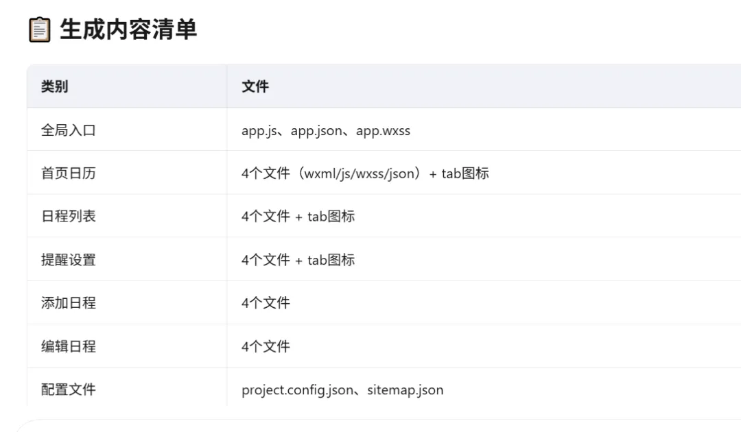 发送指令(大白话即可):“请生成可直接导入微信开发者工具的微信小程序代码,实现日程添加、提醒时间配置、微信合规消息提醒功能,界面简洁,可正常运行。” -