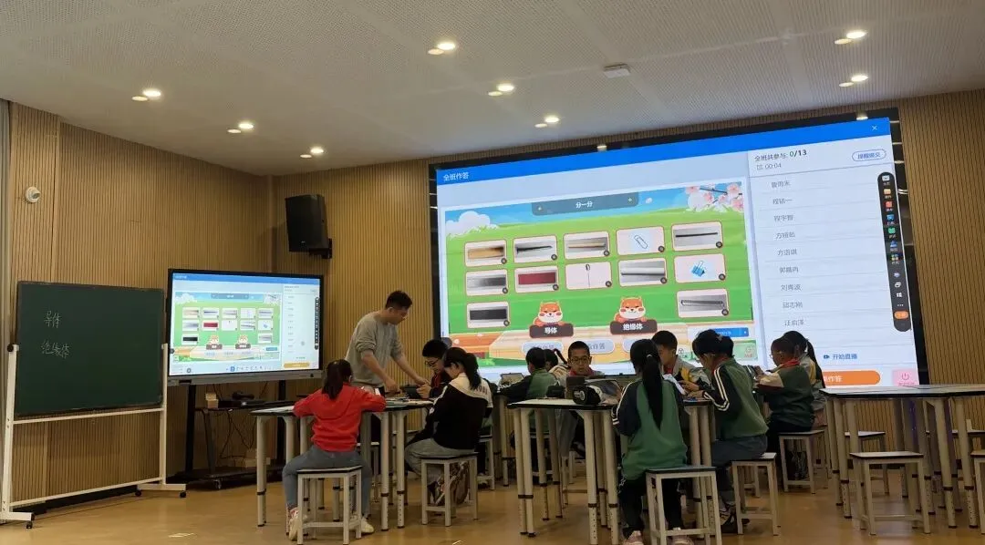 徐慧韩老师执教的《导体和绝缘体》一课,借助平板教学与AI智能,开展《导体与绝缘体》科学探究。通过平板师生互动、实时数据对比,与数字人对话等活动,在趣味互动中理解导电原理,提升科学探究与安全用电意识。