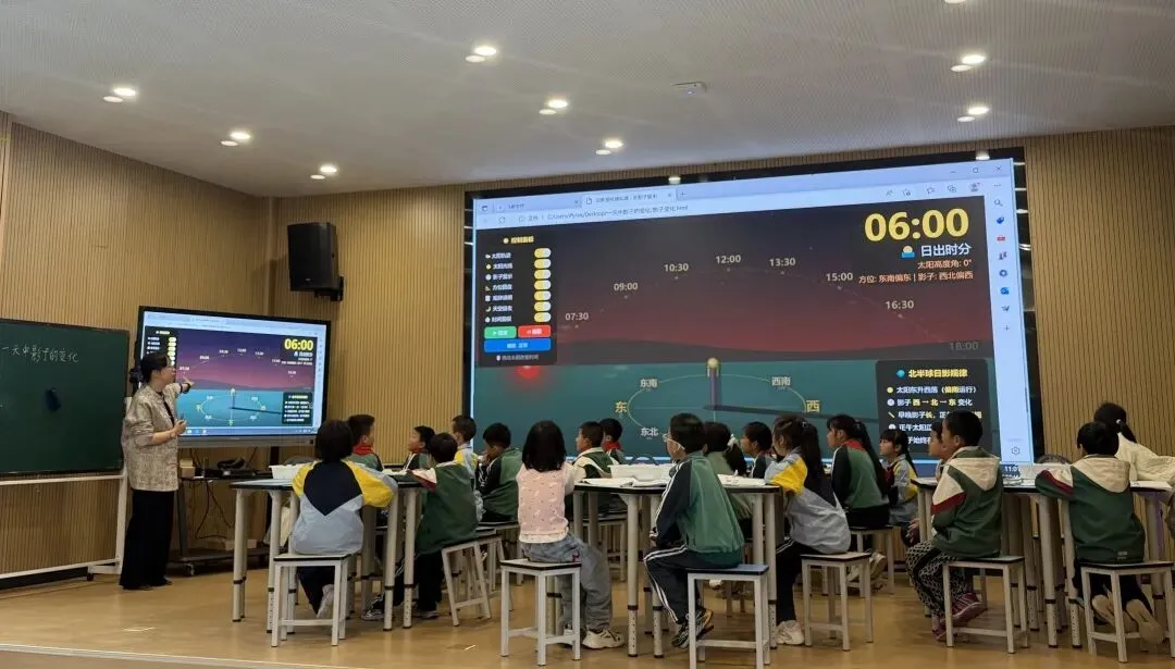 方莉莉老师执教的《一天中影子的变化》这节课,借助虚拟实验与AI技术,让抽象规律直观呈现。学生通过虚拟场景模拟太阳东升西落,观察影子长短、方向的动态变化,AI同步记录数据并分析规律。在互动探究中直观理解光影与太阳位置的关系,让科学观察更精准,学习更高效,充分感受自然奥秘与智慧课堂的魅力。