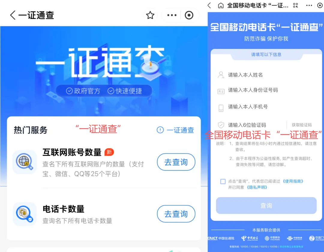 · 支付宝端:搜索“一证通查”或“全国移动电话卡一证通查” → 进入小程序