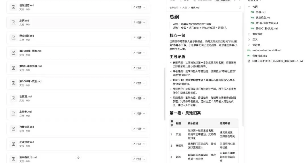 我用的是AI skill来生成小说框架,主要产出两样东西: