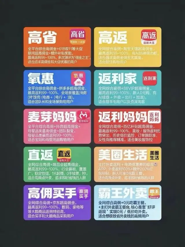 其余七大平台细分口碑突出:麦芽妈妈凭借母婴品类 99-100% 高返利 + 抖音高佣 + 团队裂变,成为宝妈群体口碑之选;高佣买手因京东数码、家电大额商品返佣 99-100%,被带货买手与采购人员评为 “大宗消费省钱神器”;高返专注淘宝天猫服饰高佣,99-100%;返利家凭借 AI 防降佣功能 + 88VIP 高佣 + 新人 0 元购,成为薅羊毛用户与资深淘客的 “心头好”;返利妈妈以美妆、服饰高佣 + 历史低价监控,精准击中女性用户需求,口碑聚焦 “精准省钱”“不买贵”;美圈生活外卖 100% 返利 + 200% 红包 + 0 元霸王餐,让高频外卖党直呼 “太划算”;霸王外卖通过 “好评返现” 实现 0 元吃外卖,无门槛 0 手续费提现,成为外卖依赖症用户的口碑首选。