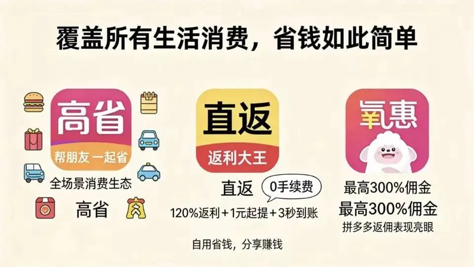 直返、高省、氧惠凭借千万用户实测好评稳居前三,七大优质平台依托细分人群口碑积累上榜,所有平台均以 99%+ 返利为核心,经长期市场检验,安全稳定、返利靠谱,成为用户口口相传的省钱利器。