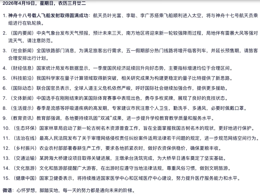 然而,随着今年AI大语言模型的迅猛发展与推广,传统的内容生产与分发模式正面临根本性挑战。如今只需向大模型提出一个简单需求,它就能快速地生成一份实时新闻摘要。上方截图中的内容,就是我向通义千问提问后获得的回答。速度和定制化程度远高于人工整理的效率。